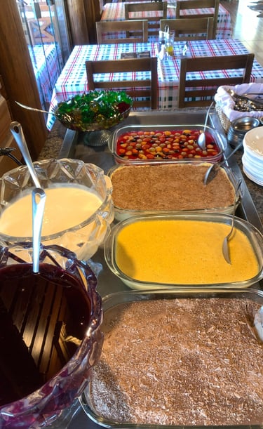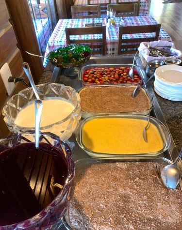 Sagu de vinho, creme branco, torta de bolacha, Banoffee, pavê de uva, mousse de maracujá, gelatinas, frutas.